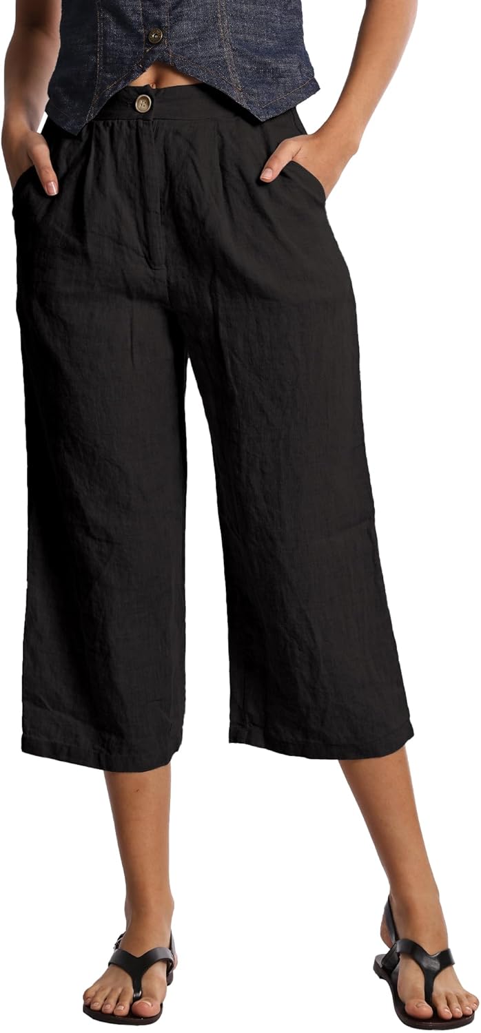 Womens Thick 100% Linen Cropped Pants with Elastic Waist and Side Pockets