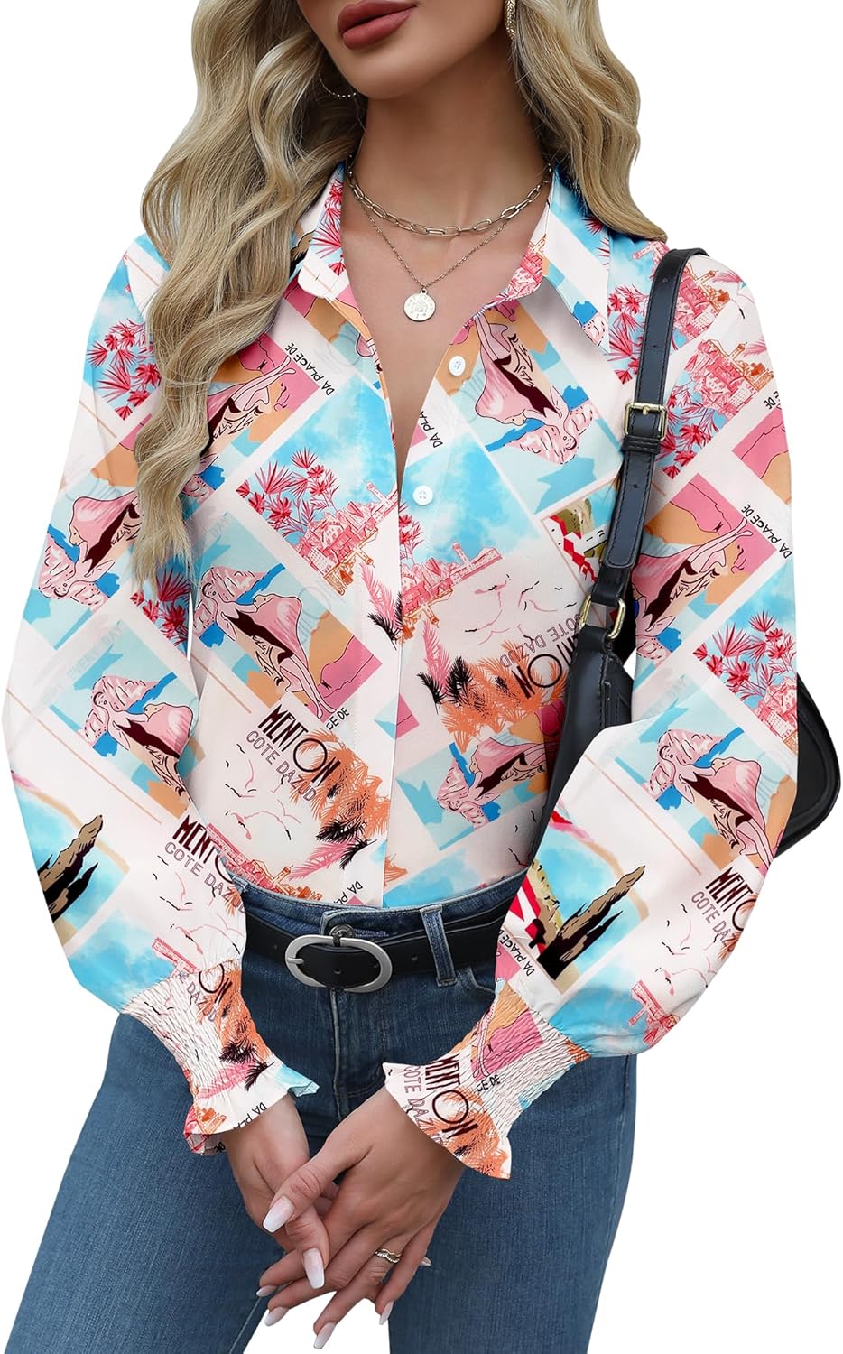 Zeagoo Womens Button Down Shirts Smocked Cuffed Blouses Printed Lantern Shirt Long Sleeve Tops Casual Collar Business Fashion
