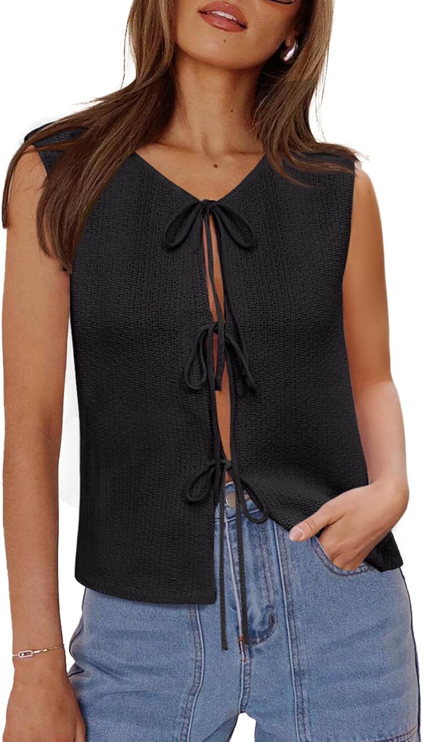 Yousify Women’s Tie Front Sweater Vest 2025 Sleeveless Crochet Knit Summer Y2K Going Out Tops