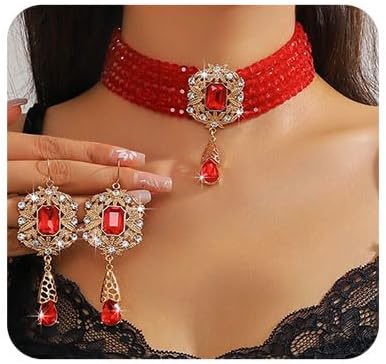 Missgrace Women Silver Black Green Red Rhinestone Crystal Tassels Bridal Necklace Earrings Sets Teardrop Necklace Dangle Earrings Set for Wedding Brides Bridesmaid