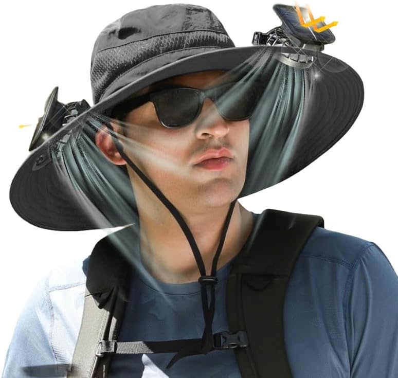 Solar Fan Hat, Wide Brim Outdoor Fishing Hat, 2 Solar Fan, With charging wind speed display, Rechargeable via Solar and USB, UPF 50+ Outdoor Fishing Hiking Gardening Summer Cooling Hat for Men Women