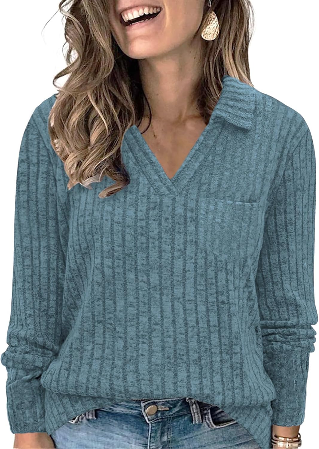 VISLILY Womens-Plus-Size-Tops Collared V Neck Polo Shirts Lightweight Long Sleeve Sweaters Trendy Pocket Decor Tunic Blouses
