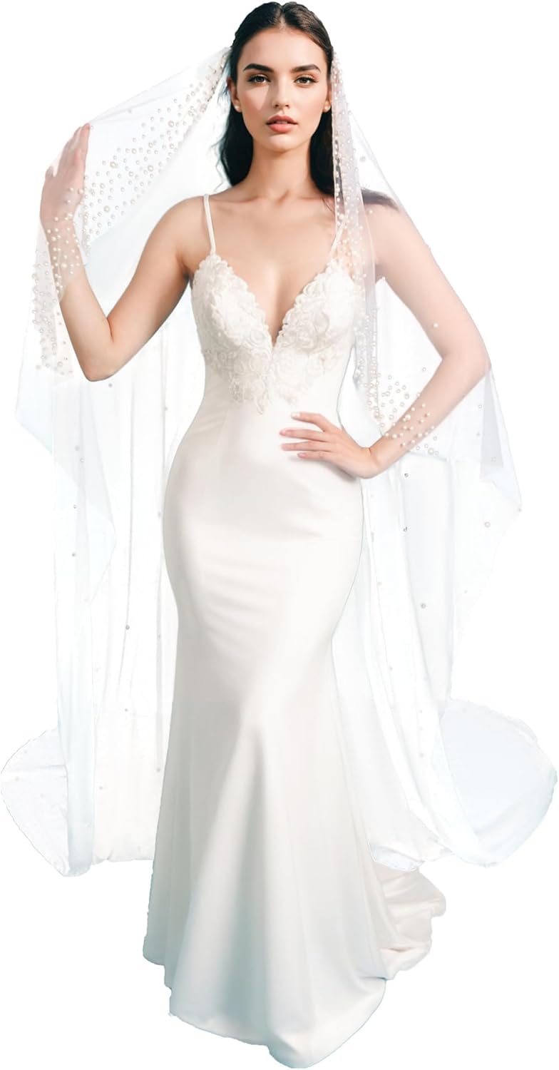 1Tier Bridal Pearl Beaded Ivory Bridal Wedding Veil Cathedral Length Off White