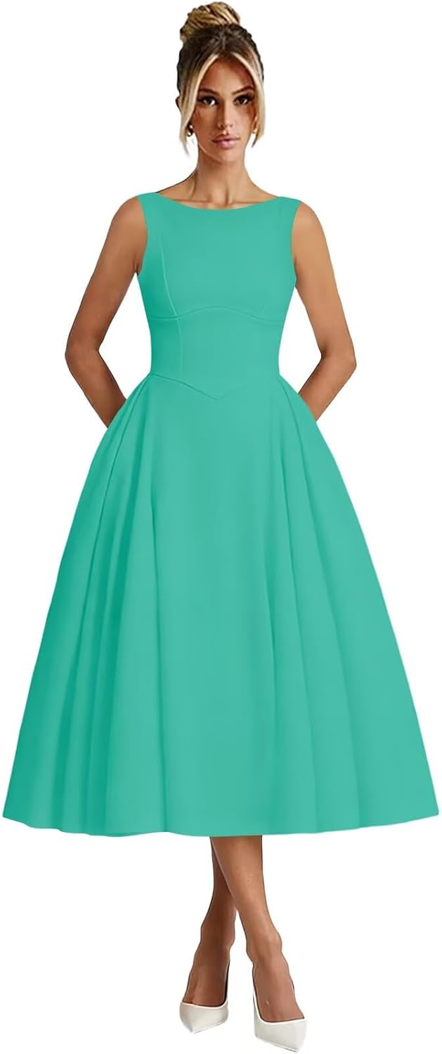 Ouyisha Satin Boat Neck Prom Dress A Line Elegant Tea Length Formal Evening Party Gowns with Pockets 2026