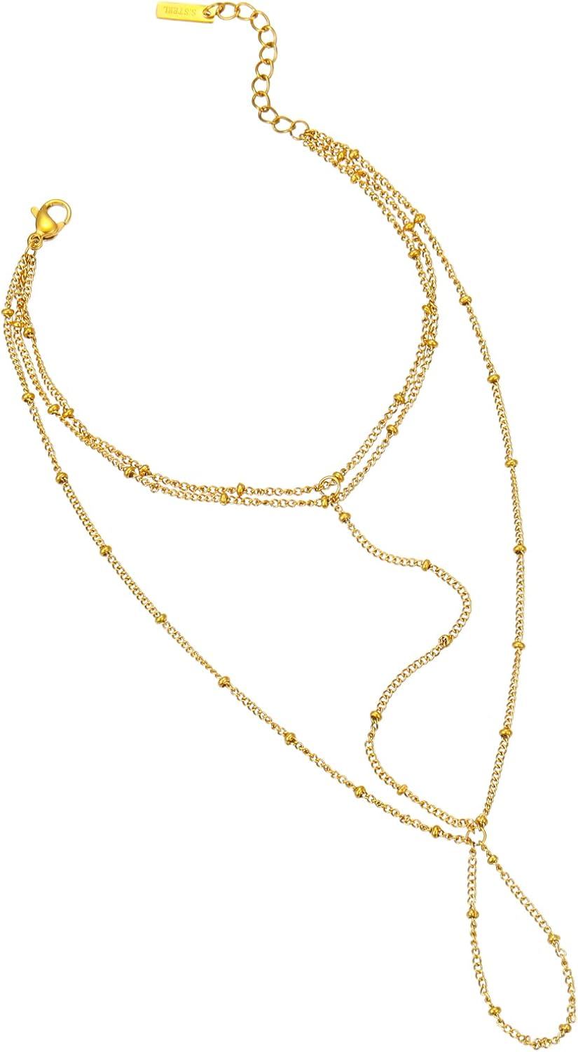 18K Gold Plated Hand Chain Bracelets for Women, Dainty Cubic Zirconia, Heart, Beads, Bamboo Link Charm Bracelet, Trendy Adjustable Finger Ring Bracelet, Hand Chain Jewelry, Christmas Gifts