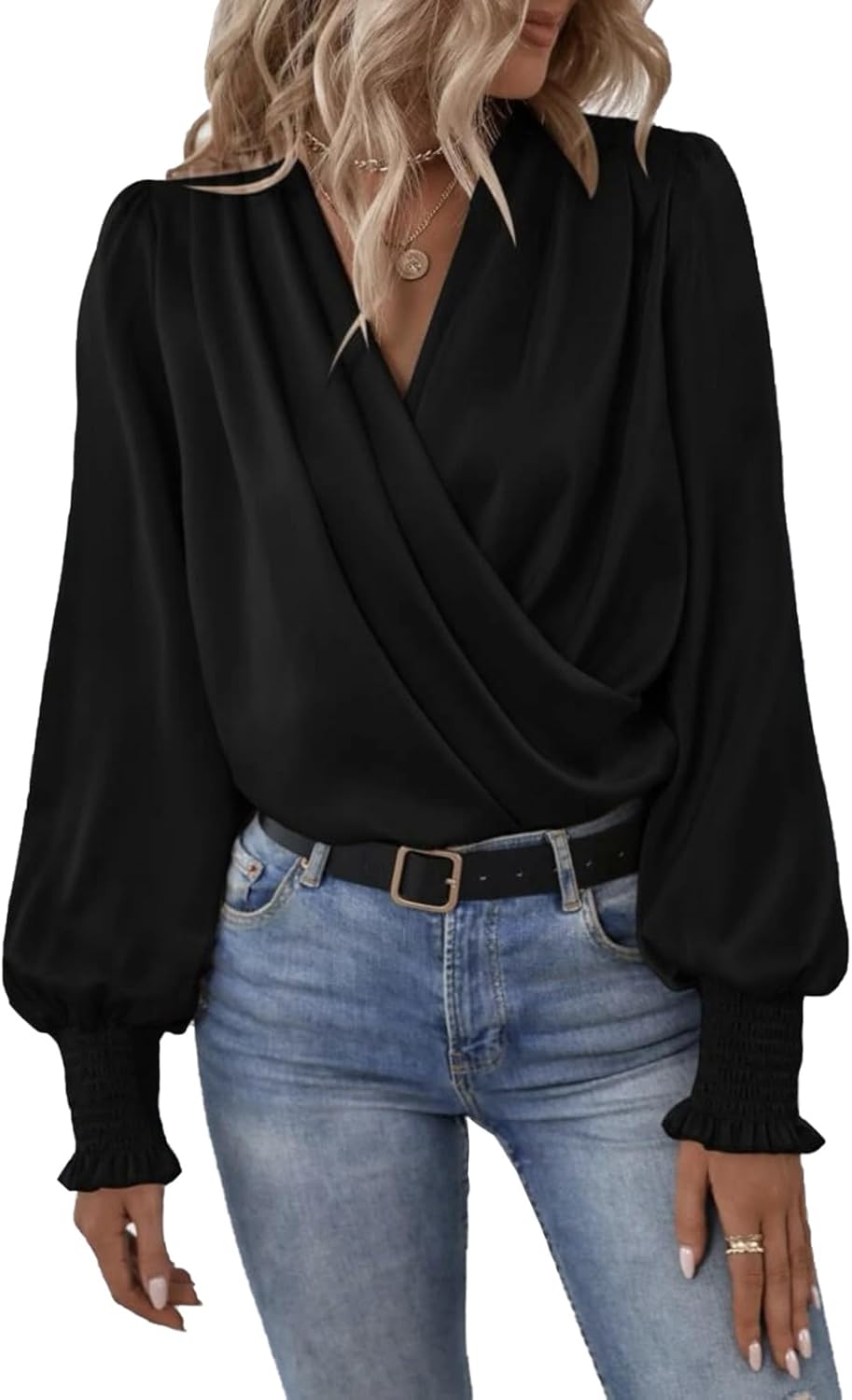 Women Fall Silk Satin Tops V Neck Wrap Lantern Long Sleeves Shirts Office Work Tunic Tops Elegant Blouse