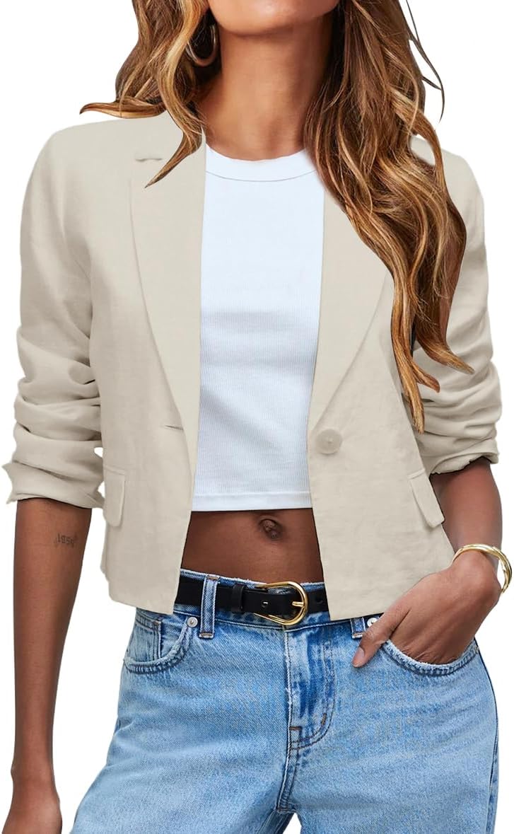 IDEALSANXUN Womens Cropped Blazer Casual Lightweight Cotton Linen Blazer Suit Jackets