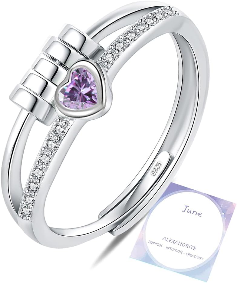 Birthstone Rings for Women,Dainty Sterling Silver Gold Plated Fidget Rings,Anxiety Heart Ring,Adjustable Spinner Birthstone Ring for Women,Birthday Christmas Gifts for Wife Daughter Sister