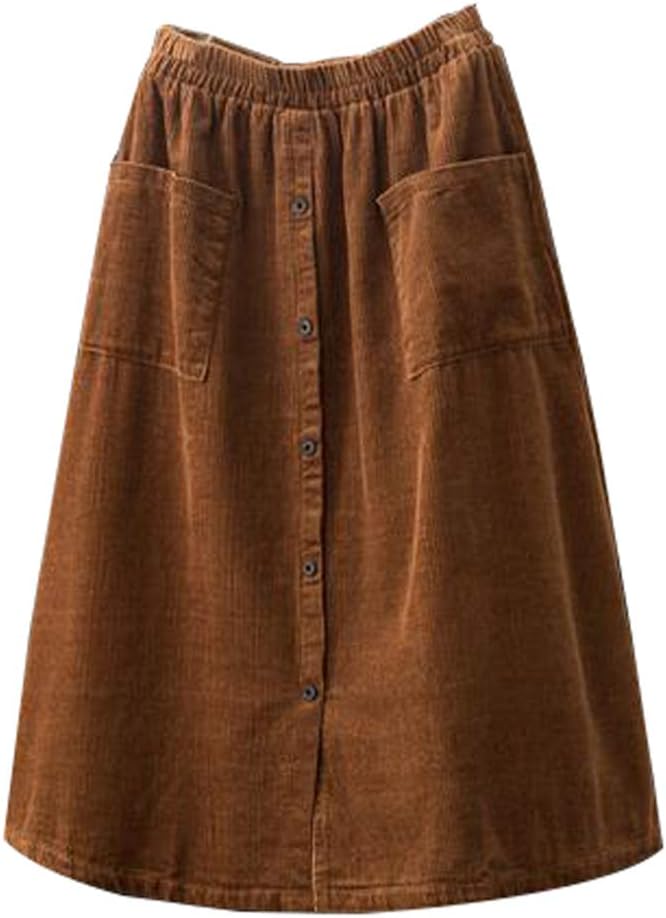 Minibee Women's Corduroy Midi Skirt Front Split Buttons Decoration A-Line Dress