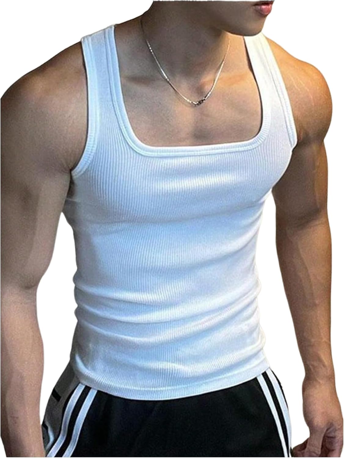 Men's Sleeveless Tank Tops Square Neck Ribbed Knit Slim Fit Basic Gym Workout Tank Undershirts