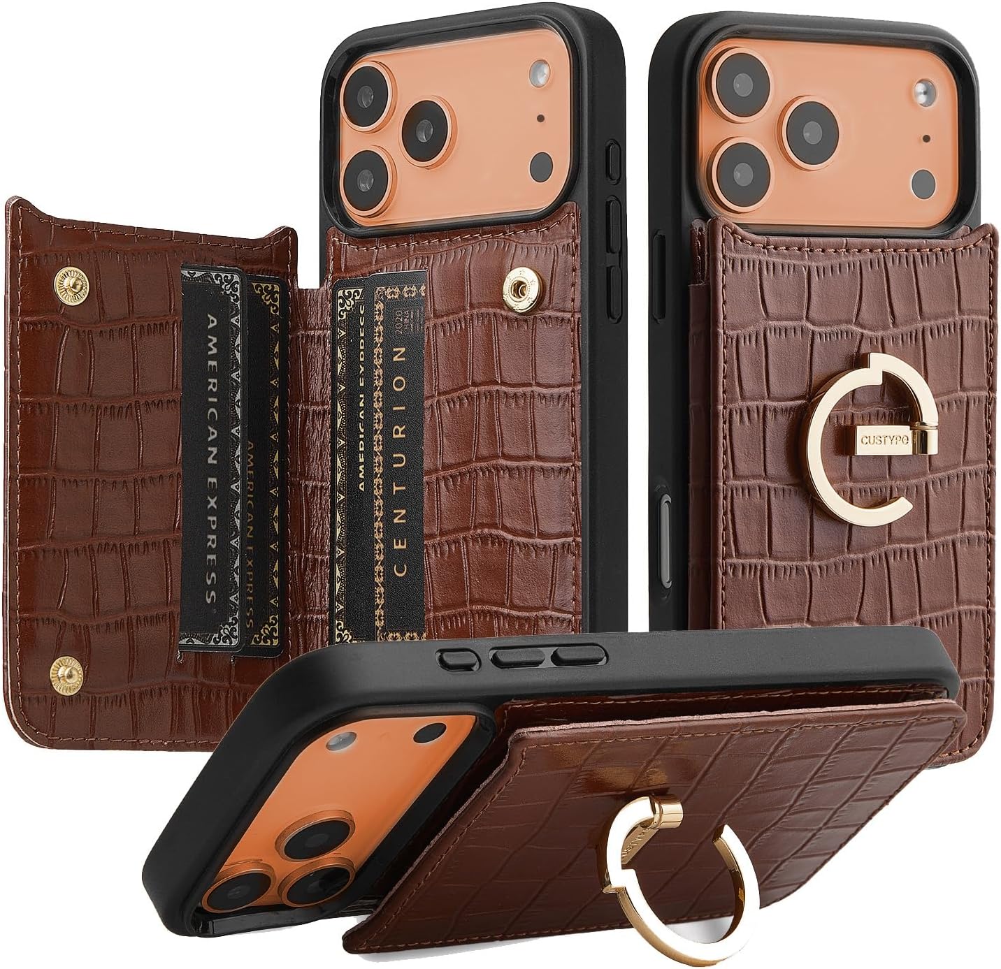 CUSTYPE Compatible with iPhone 17 Pro Wallet Case with Card Holder,180°Ring Holder Kickstand Card Slots Case,PU Leather Protective Case for iPhone 17 Pro 6.3inch-Brown