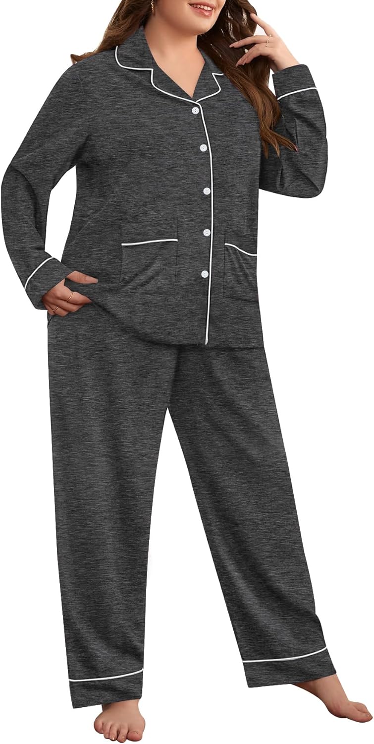 SWOMOG Women's Plus Size Pajamas Set with 2 Pockets Long Sleeve Button Down Sleepwear Soft PJs Pants Postpartum Lounge Sets