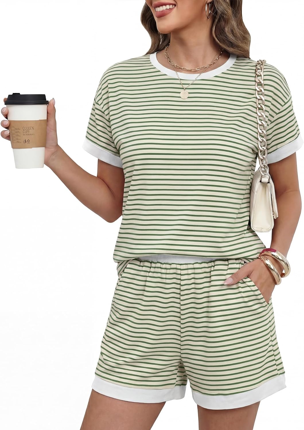 Blingfit Womens 2 Piece Lounge Set Short Sleeve Summer Vacation Outfits Casual Matching Sets Soft Shorts with Pockets