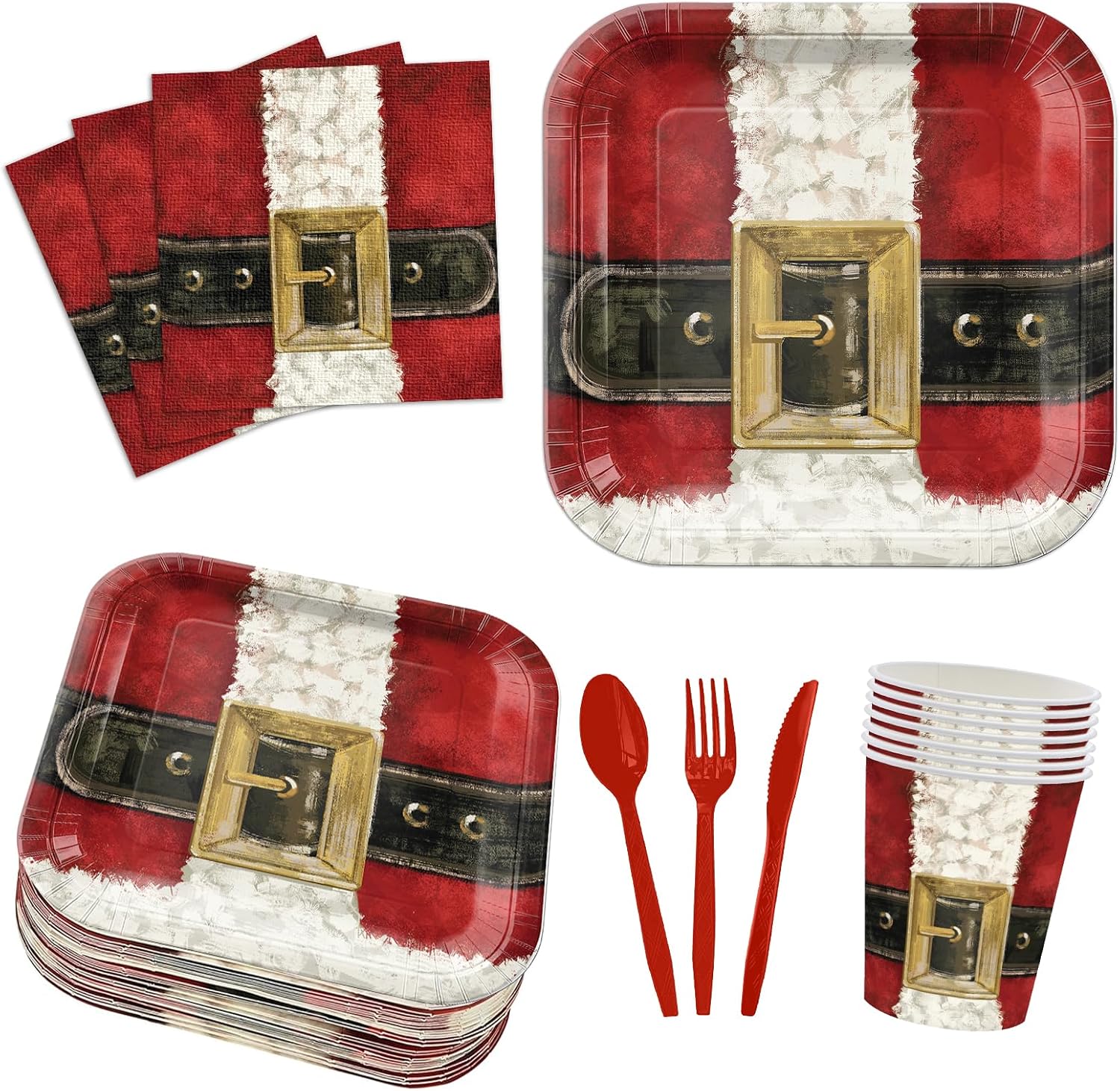 168PCS Christmas Party Supplies Red Santa Belt Party Decorations Winter Santa Claus Suit Paper Plates Napkins Forks for Xmas Holiday Birthday Baby Shower Home New Year Party Decor Serves 24