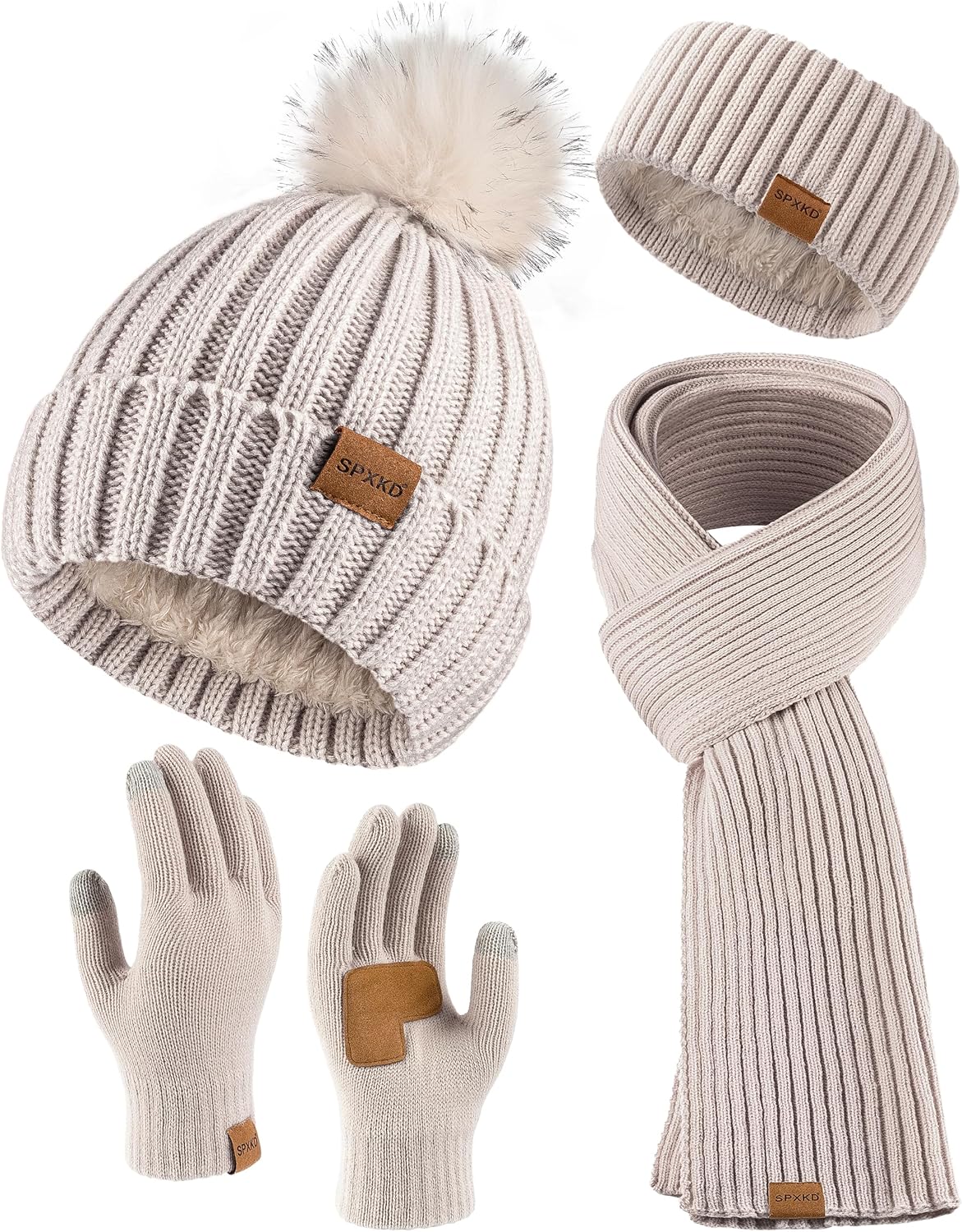 Womens 4Pcs Beanie Scarf Gloves Headband Set Fleece Lined Beanie & Headband Earmuff, Scarf and Touchscreen Gloves