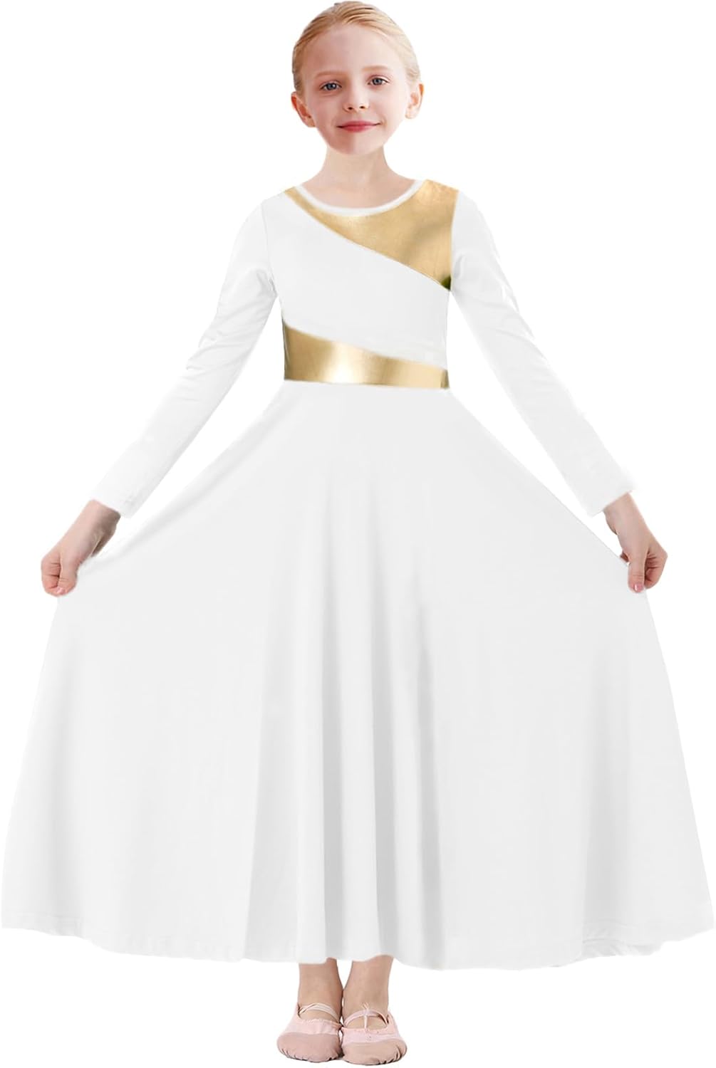 ORIDOOR Girls Praise Dance Dress Metallic Gold Liturgical Worship Church Robe Full Length Swing Lyrical Costume