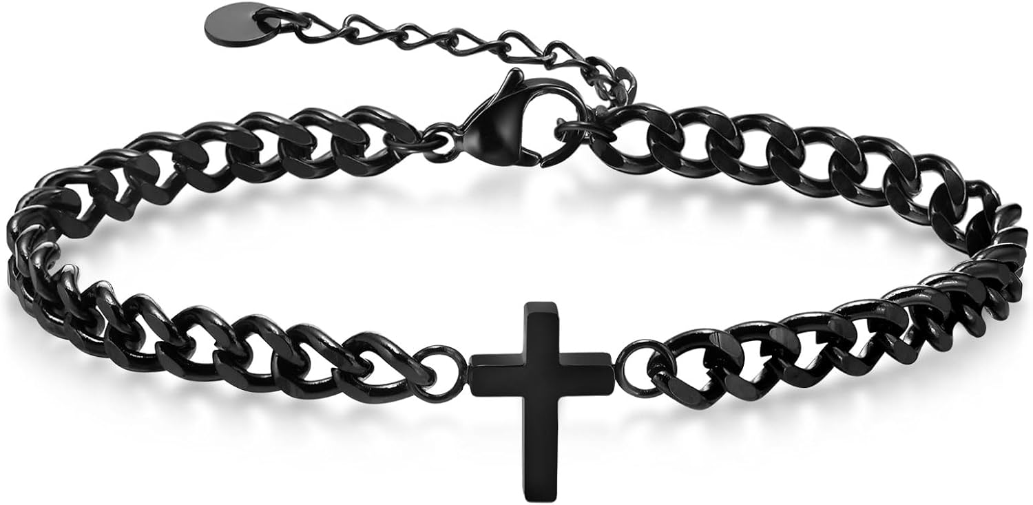Cross Chain Bracelets for Men Women, Silver/Black Stainless Steel Cross Charms Men's Bracelet, Faith Religious Easter Catholic Christian God Jesus Communion Baptism Jewelry Gift Mens Link Bracelet