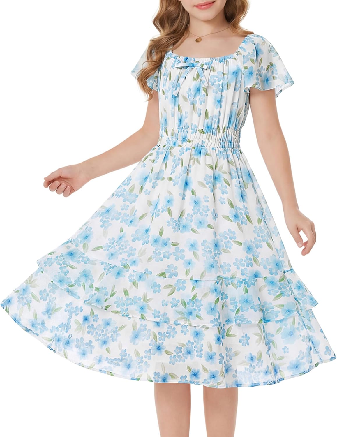 GRACE KARIN Girls Floral Summer Dress Flutter Sleeve Square Neck Midi Casual Dress for Girl 6-14Y