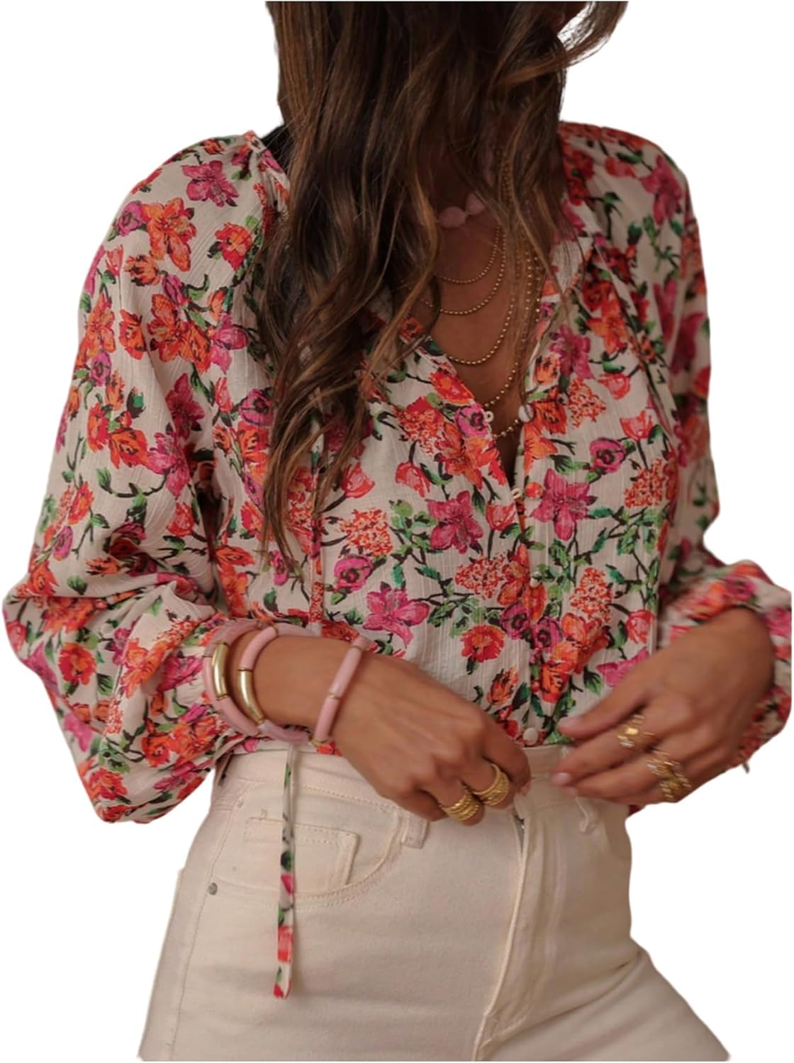 GORGLITTER Women's Boho Floral Blouse Bishop Long Sleeve Button Down Shirt Fall Outfits 2025