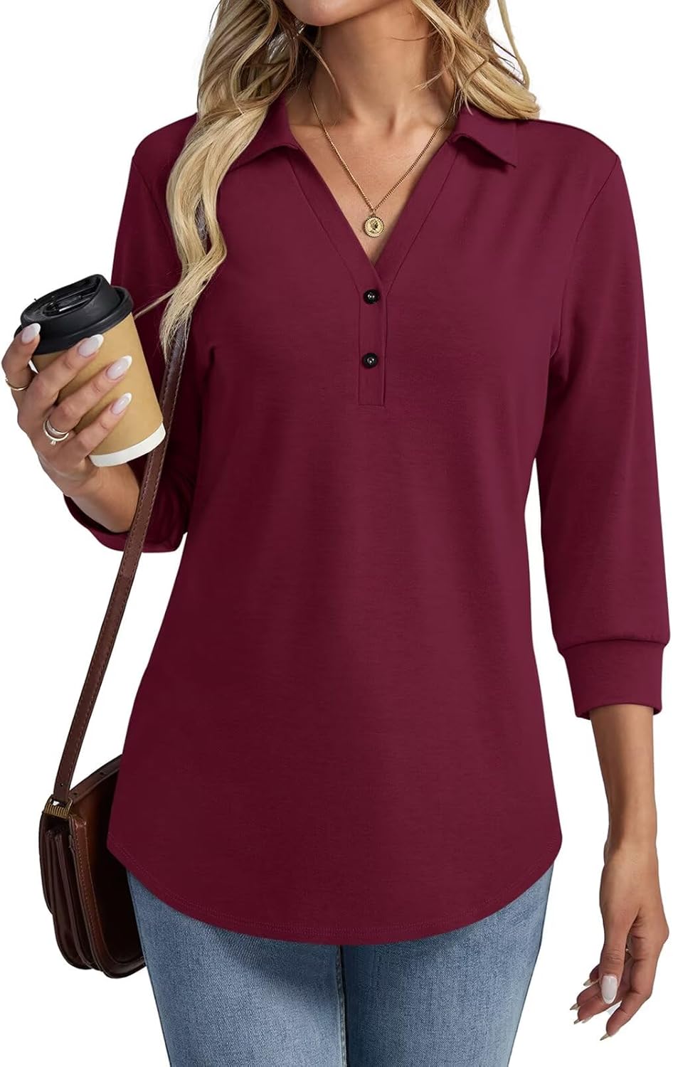 Women's V Neck Polo Shirts 3/4 Length Sleeve Tops Collared Business Casual Summer Blouses