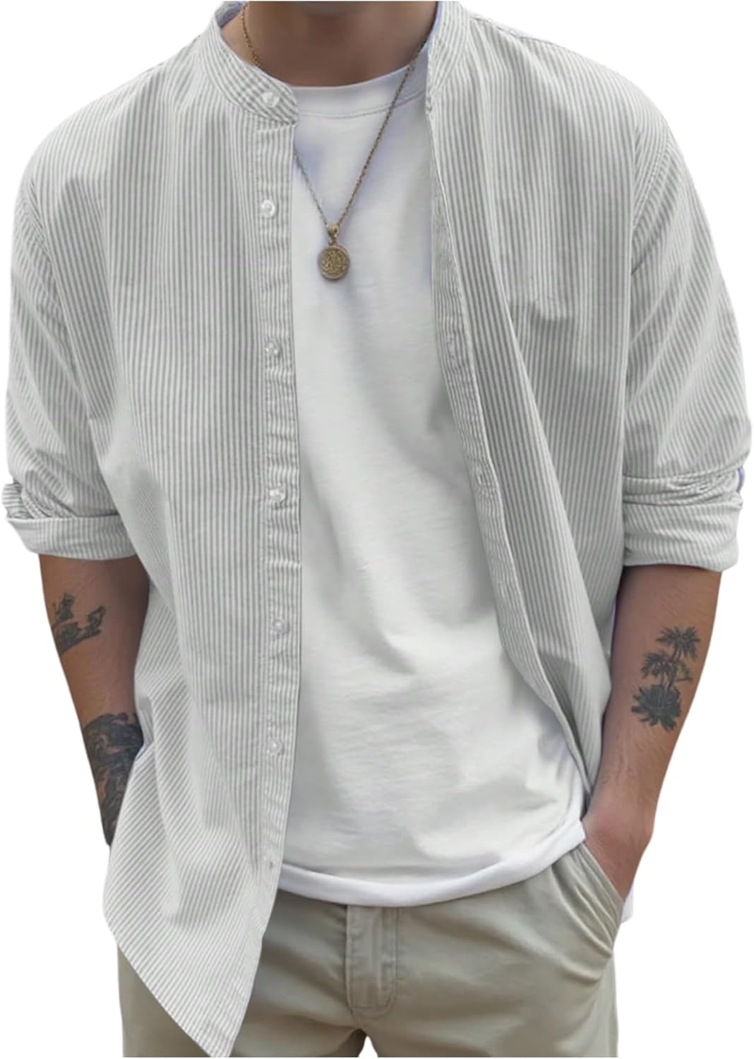 SHENHE Men's Striped Button Down Shirt Long Sleeve Banded Collar Business Casual Shirt Top