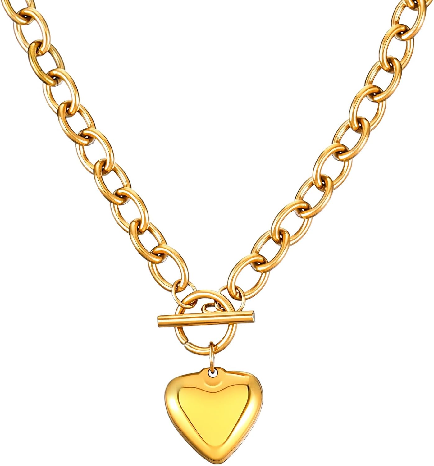 Valentine's Day Necklace for Women Chunky Gold Necklace, Heart Pendant Necklaces with Toggle Clasp, Trendy Chunky Chain Necklaces Large Vintage Statement Jewelry for Valentine's Day Gifts