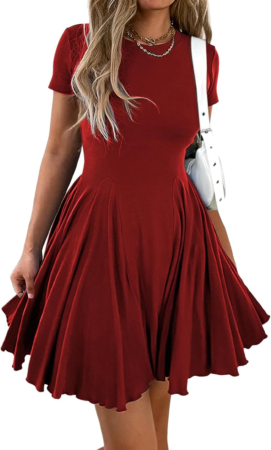 Womens Summer Fit and Flare Swing Flowy Mini Dress Casual A Line Crewneck Pleated T Shirt Skater Dress Beach Sundress