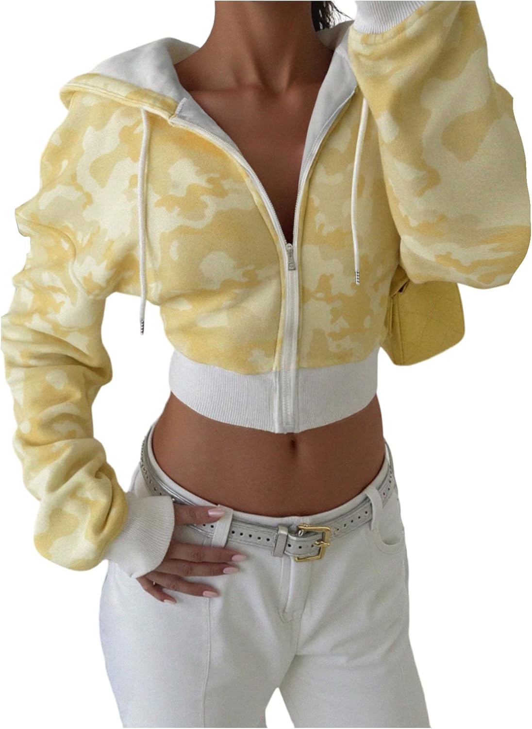 Women's Camo Print Cropped Hoodie Zipper Front Long Sleeve Sweatshirts Streetwear Tops