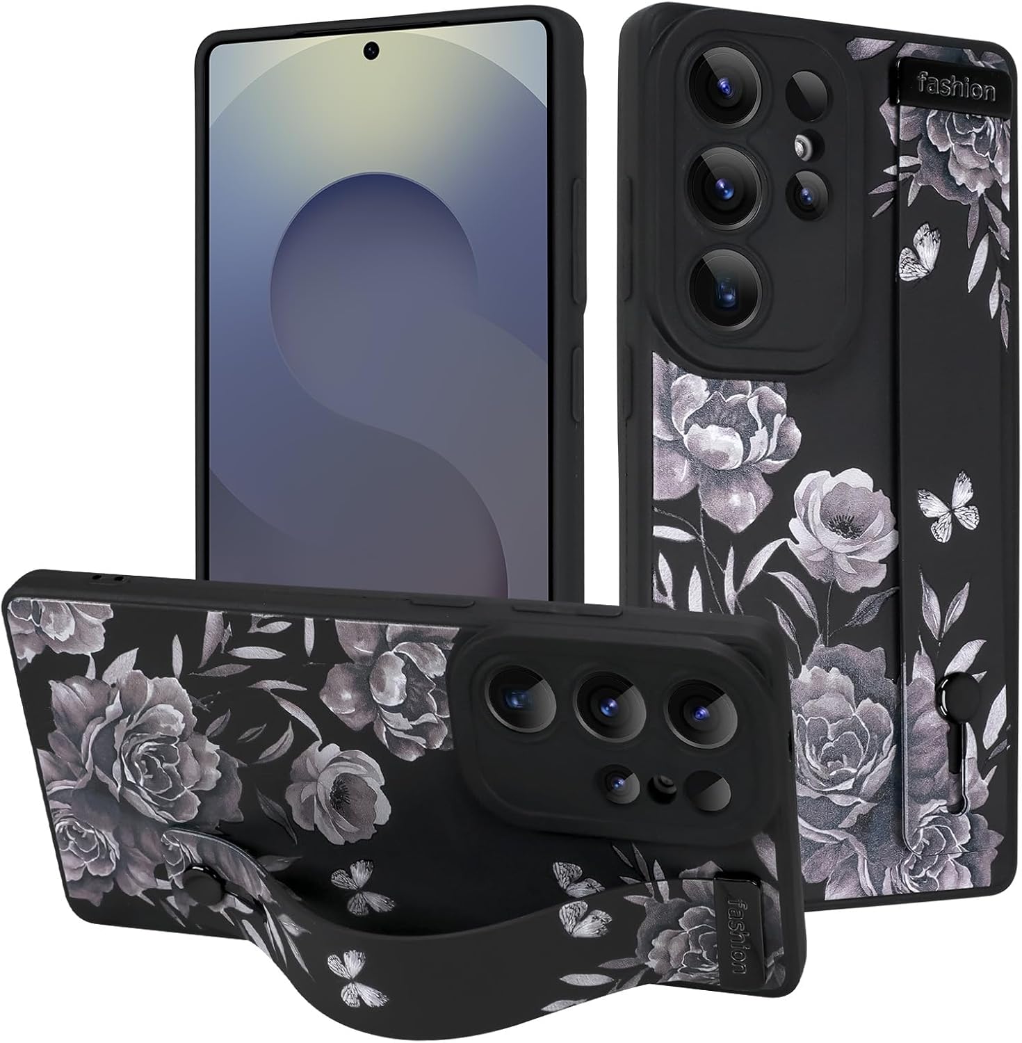 MOWIME for Samsung Galaxy S25 Ultra Case with Wrist Strap, Cute Flower Rose Butterfly Design Soft TPU Protective Case for Women Girls Slim Shockproof Cover with Adjustable Kickstand Holder - Black