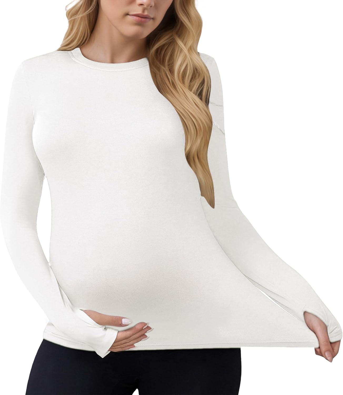 Women's Maternity Workout Tops Stretchy Fitted Crew Neck Long Sleeve Thumbholes Pregnancy Yoga Basic Undershirts