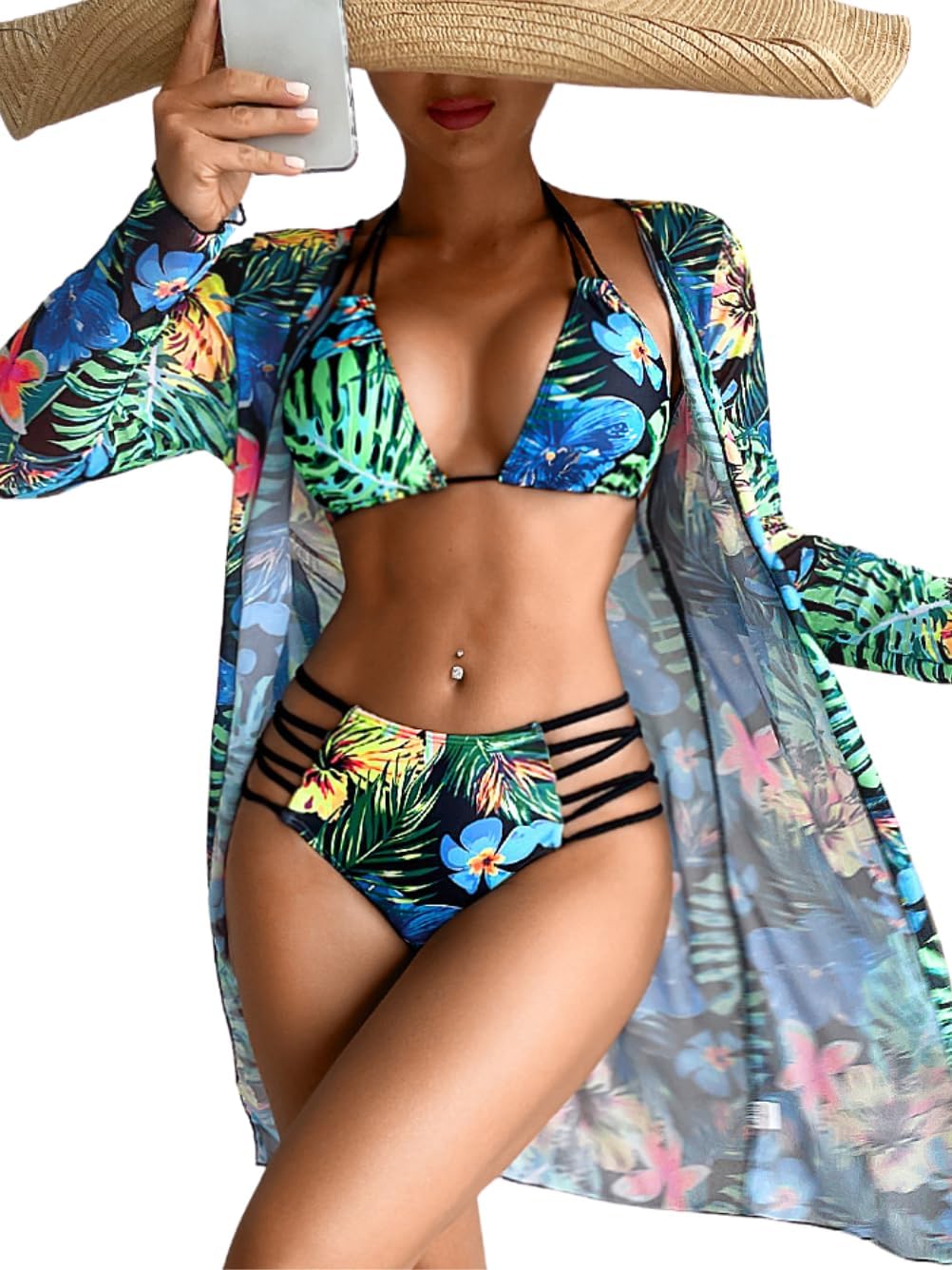 Women's 3 Piece Tropical Bikini Set with Mesh Coverup, Sexy Crisscross Cutout Swimsuits for Pool Party