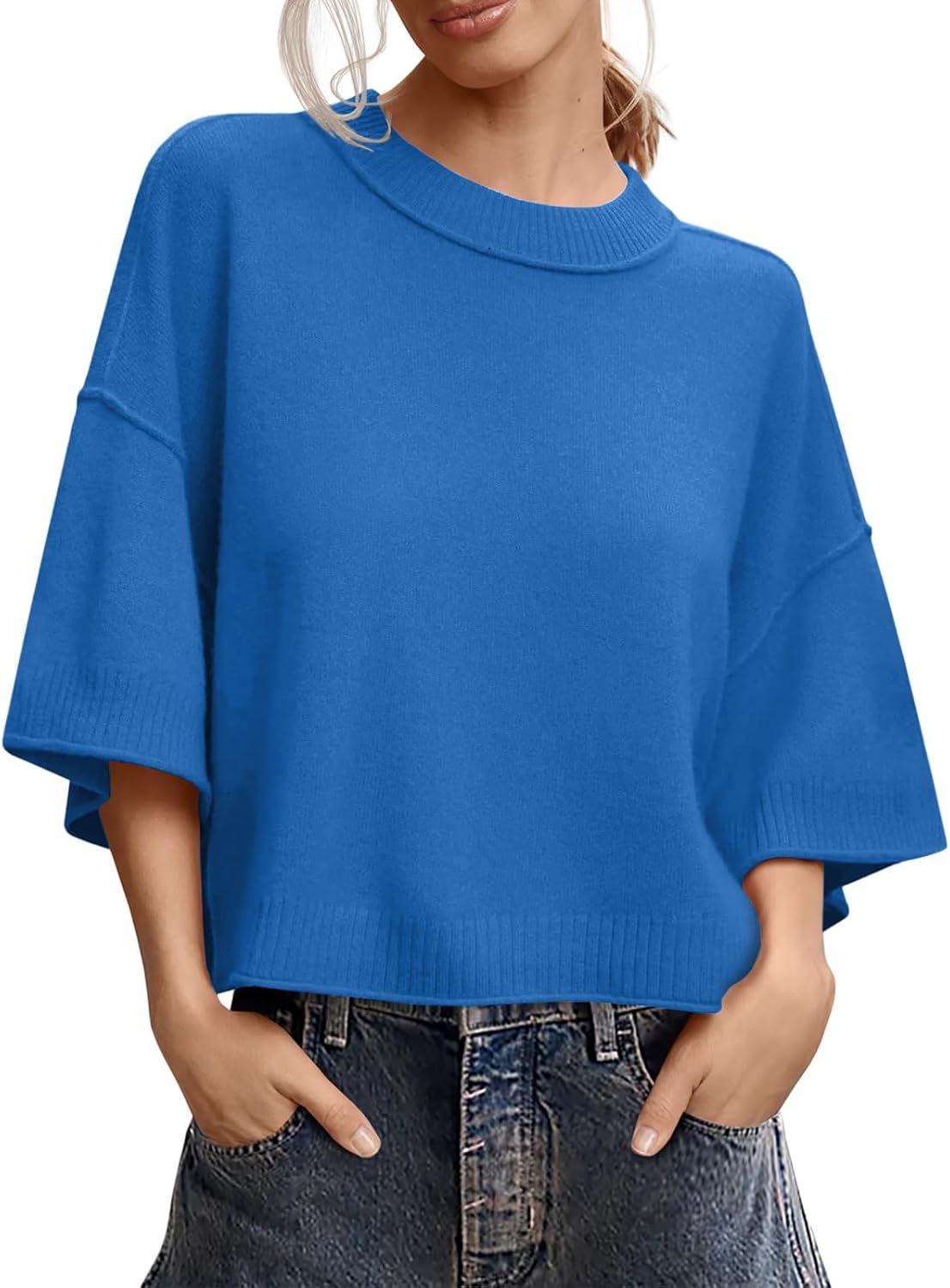 Women's Short Sleeve Cropped Sweaters 2025 Summer Oversized Loose Fit Drop Shoulder Casual Sweater Tops