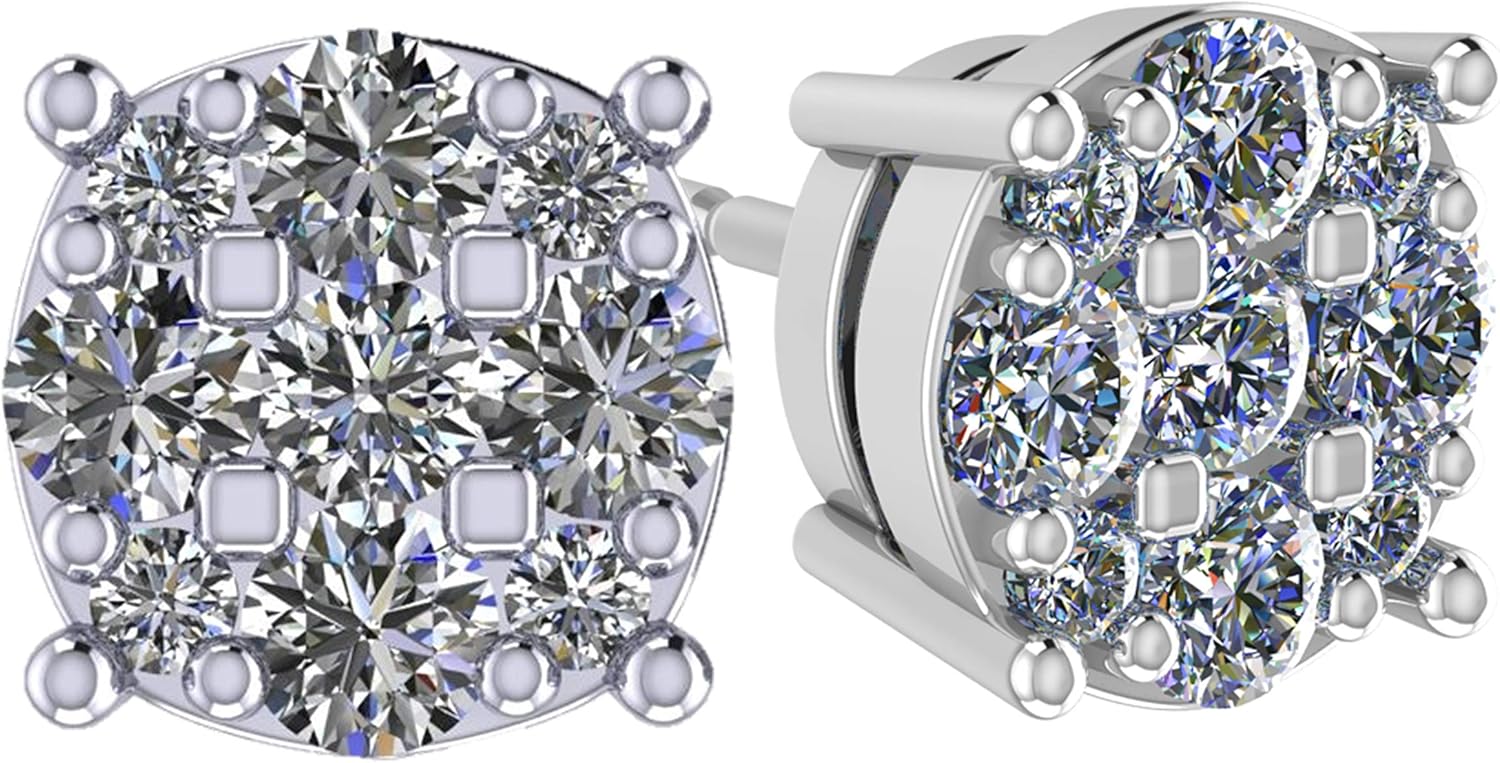 Diamond Stud Earrings CVD Lab Grown Diamonds solid 14K post & Silver basket, 7 or 9 Stone Cluster