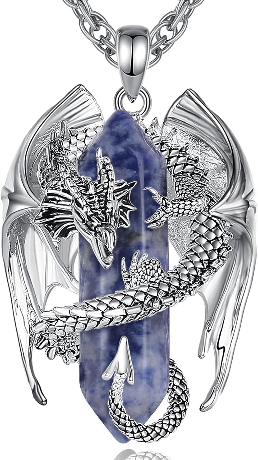 INFUSEU Unique Dragon Necklaces with Healing Crystal Stone for Men Women, Personalized Spiritual Gifts, 24 Inch Chain