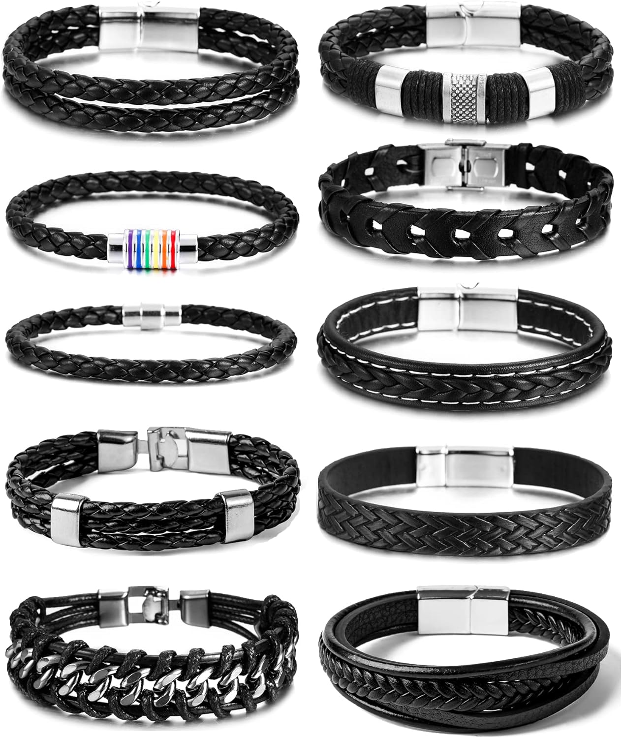 BOMAIL 10Pcs Black Leather Bracelets for Men Women Braided Leather Wristband Cuff Bracelets Punk Leather Bracelets Set
