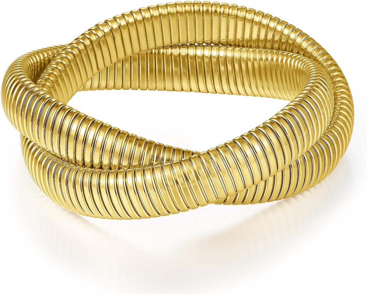 Emibele Gold Bangles Bracelet Set for Women, 18K Gold Plated Chunky Stainless Steel Non Tarnish Stretch Bracelet Stack, Flexible Wide Wristband Bangle Layered Snake Chain Bracelets