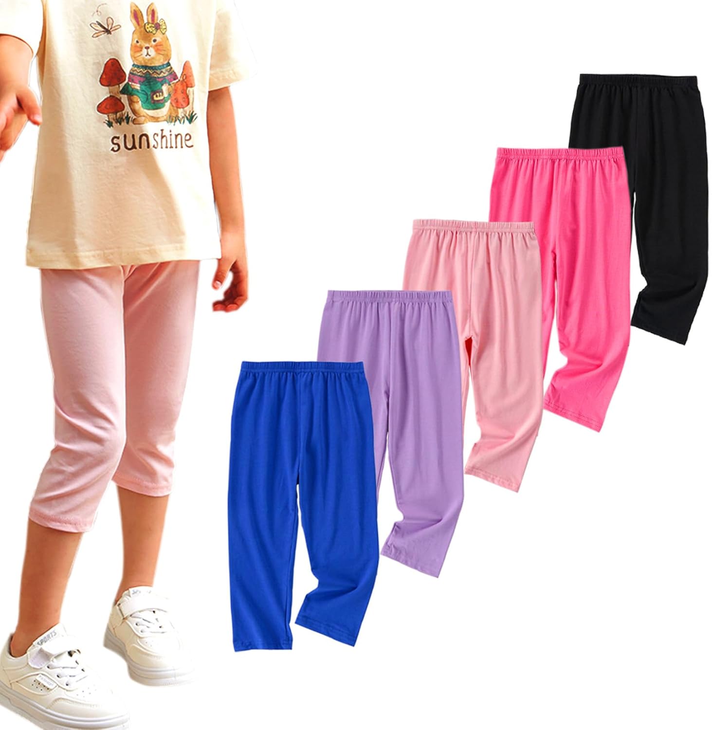 VVEEWUU 5 Pack Cotton Cropped Leggings for Girls 3/4 Pants Basic Girls Capri Leggings