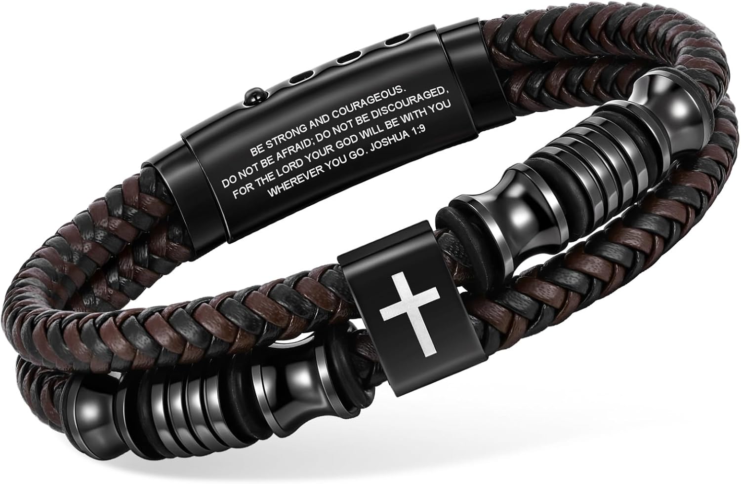Christian Brown Leather Bracelet for Men - Double-Row Braided Leather Faith Cross Bracelets Bangle Religious Baptism Inspirational Bible Verse Jewelry Gift for Young Men Teenage, Adjustable Wristband