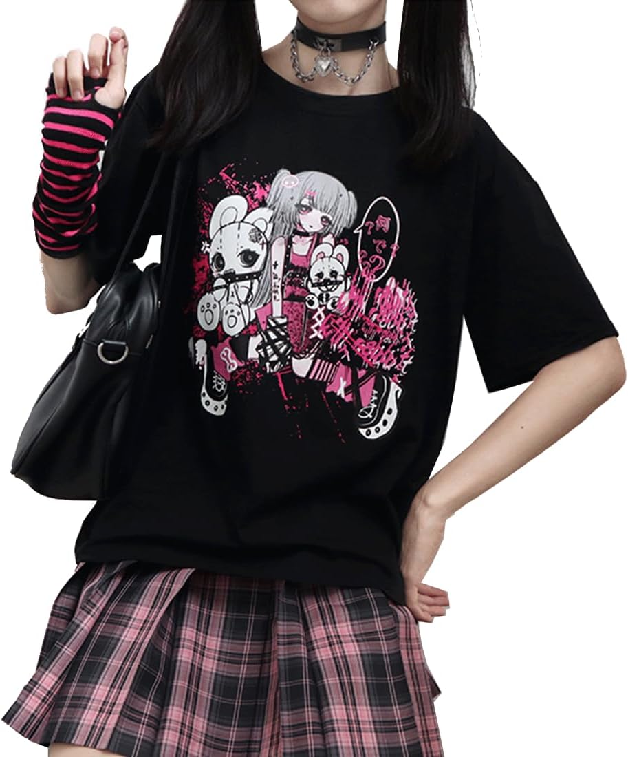 Harajuku Y2K Pastel Kawaii Gothic Clothes Casual Style Soft Crewneck Comic Print Dark Punk Girl T-Shirt