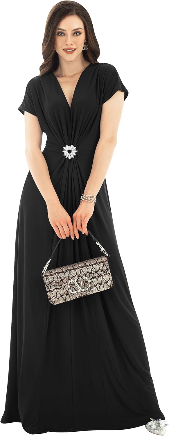 KOH KOH Womens Long V-Neck Short Sleeve Semi Formal Wedding Gown Maxi Dress
