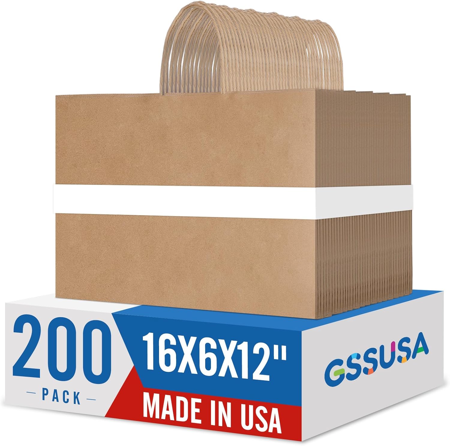 GSSUSA Large Brown Paper Bags with Handles 16x6x12 200 Pcs, Kraft Paper Gift Bag Bulk Bags for Small Business, Grocery & Retail, Boutique Shopping, Merchandise Packaging