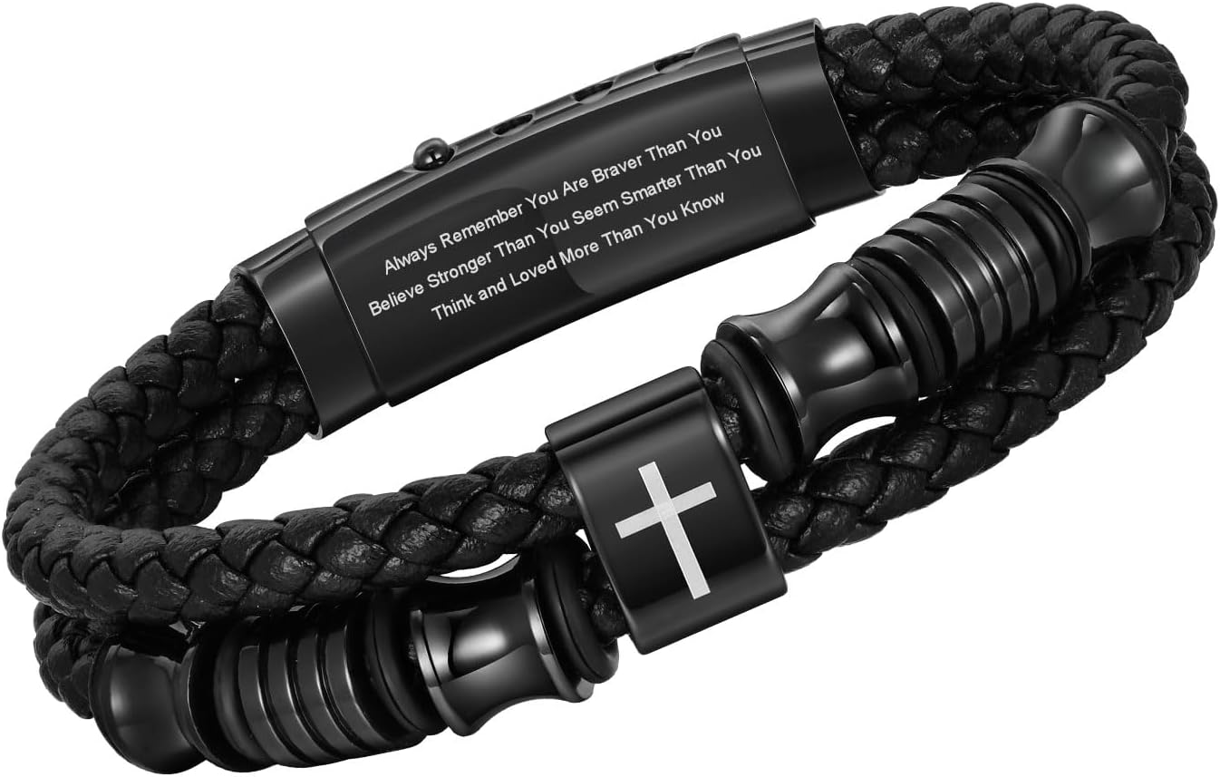 TempBeau Christian Black Leather Bracelet for Men - Double-Row Braided Leather Faith Cross Bracelets for Mens Jewelry Gift Religious Baptism Easter Gifts for Young Men Teenage,Adjustable Wristband