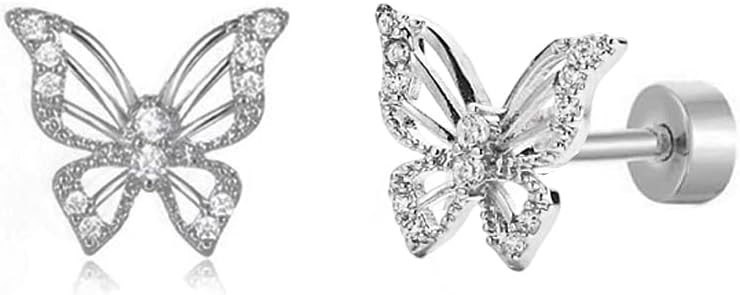 Cute CZ Butterfly Flat Back Stud Earrings Hypoallergenic 20G Cubic Zirconia Tiny Cartilage Tragus Helix Screw Back Stainless Steel Piercing Fashion Minimalist Jewelry Gifts For Women Sensitive Ears