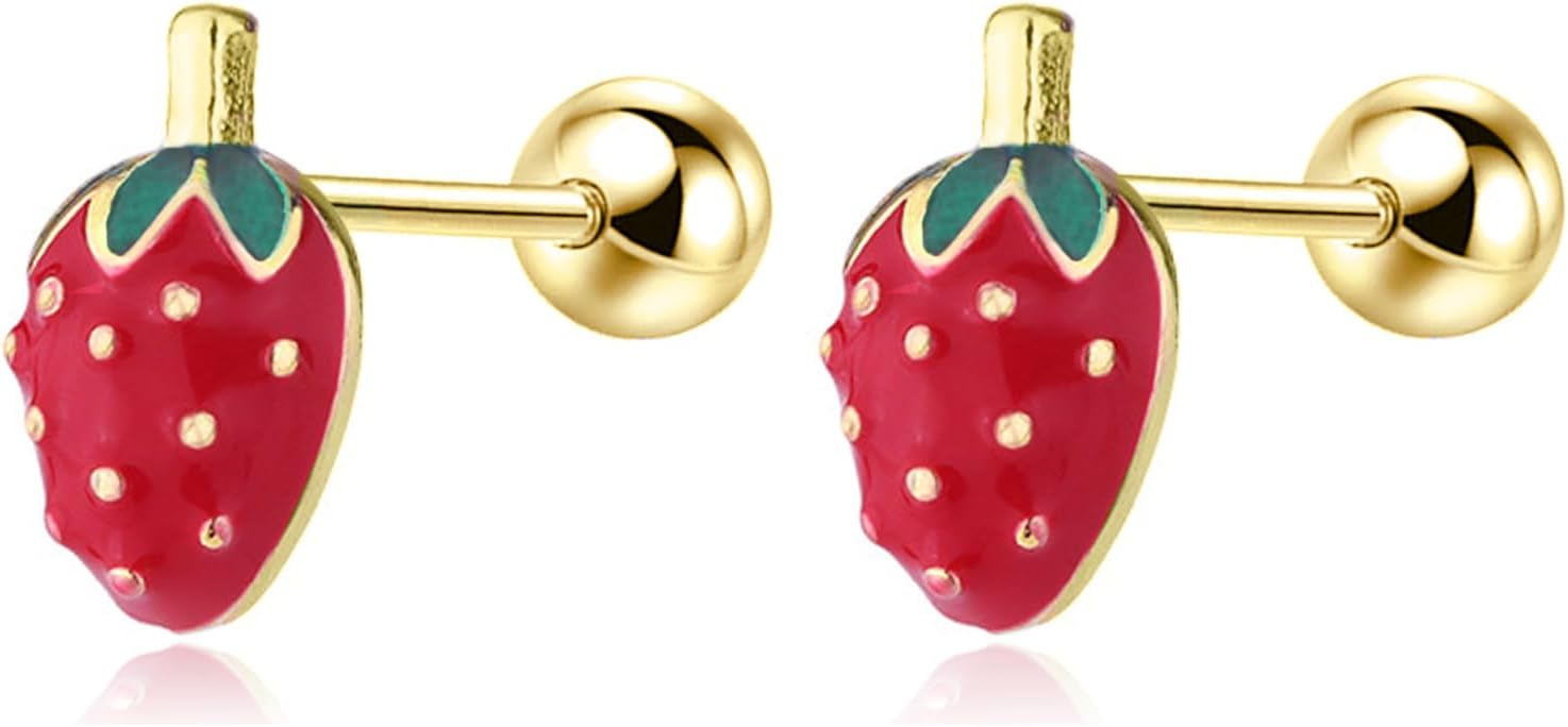 20G Tiny Red Strawberry Stud Earrings for Women Silver Plated Hypoallergenic Cute Small Ball Screw Back Studs Cartilage Tragus Post Dainty Wedding Birthday Party Fruits Jewelry Gifts