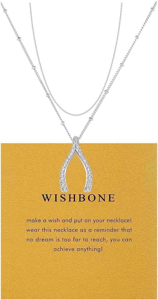 LIU JUN WishBone Necklace For Women, 14K Gold Plated Stack Two Layer Chain Make A Wish And Put On Your Good Luck Cubic Zirconia Inspirational Jewelry Gift