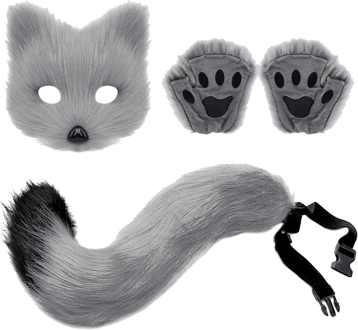 4 Pcs Therian Mask Paw and Tail Set, Plush Mask Fluffy Paw Gloves for Adult Men Women, Faux Fur Fox Tail Cat Wolf Cosplay Costume Set for Halloween Christmas Party Cosplay, Grey