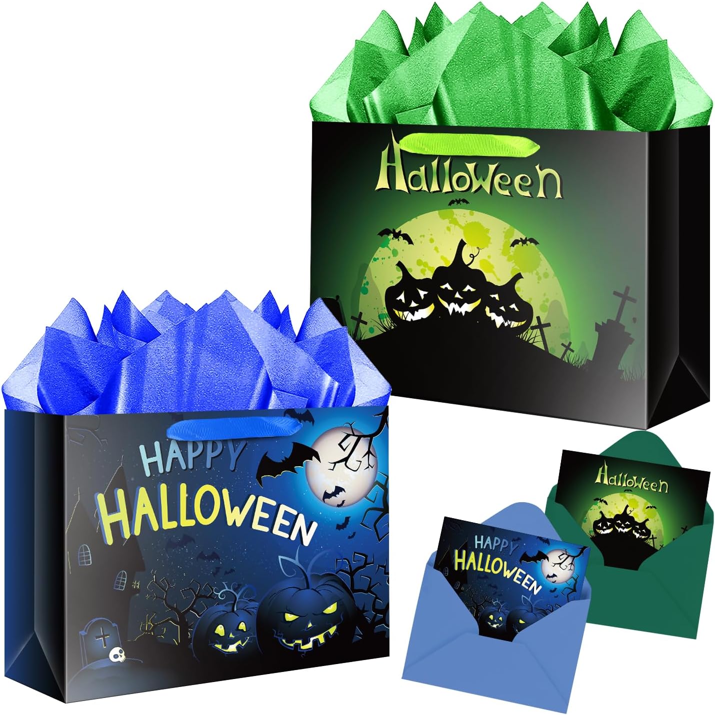 JWSCYSY 2Pack 12.6" Halloween Pumpkin Gift Bag with Card and Tissue Paper, Large Trick or Treat Gift Bags for Kids Adults Party Favor (Blue, Green)