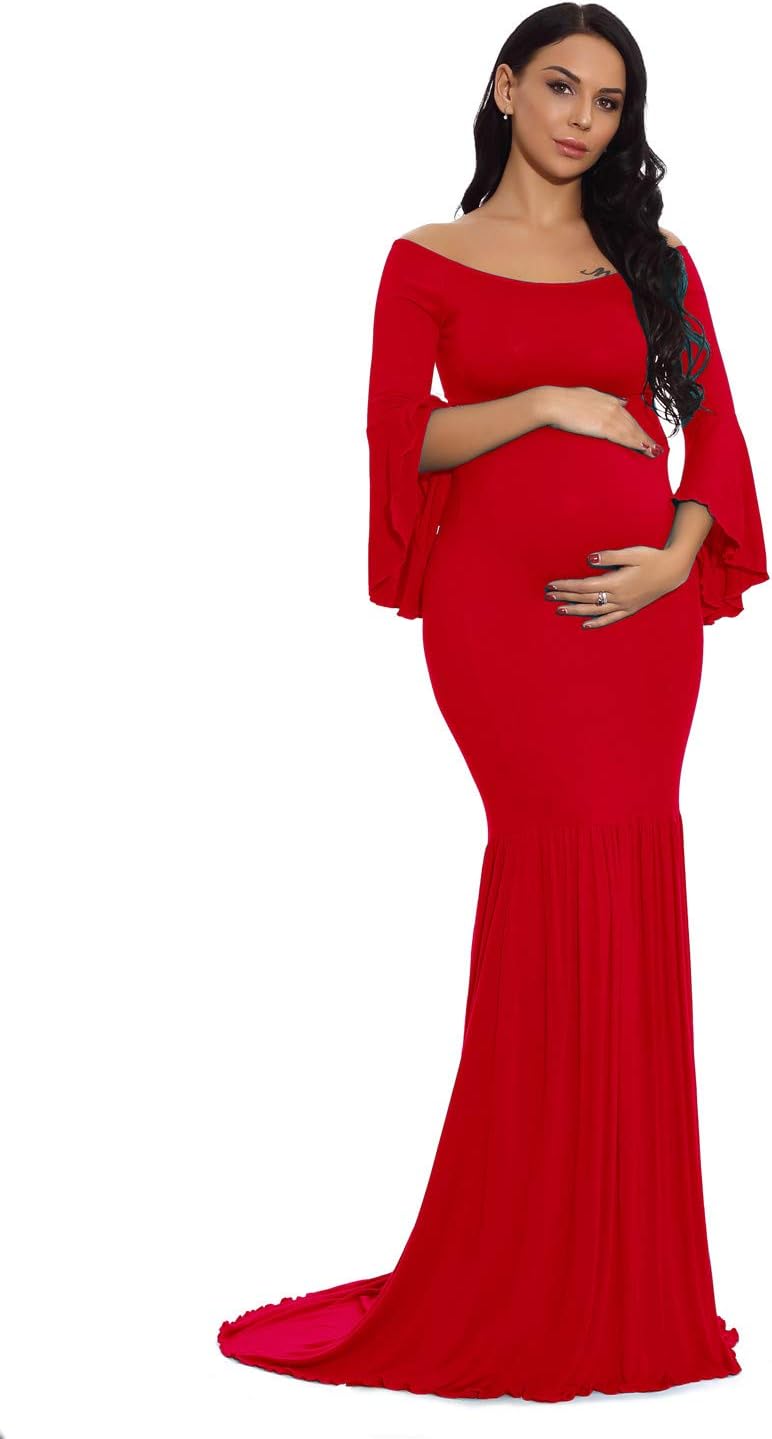 ZIUMUDY Maternity Retro Off Shoulder Flare Sleeves Mermaid Gown Maxi Photography Dress for Baby Shower