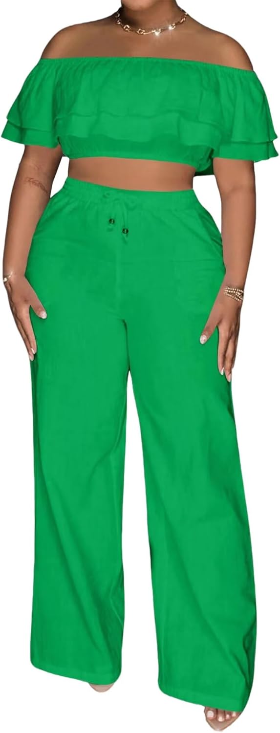 Adogirl 2 Piece Outfits For Women Off Shoulder Ruffle Trim Short Sleeve Top Wide Leg Pants Sets Sexy Outfits