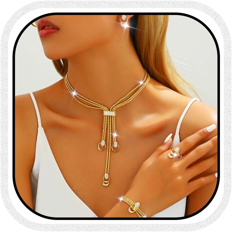 Aukmla Gold Jewelry Set Indian Necklace Earrings Bracelet Ring Sets Costume Necklaces for Women